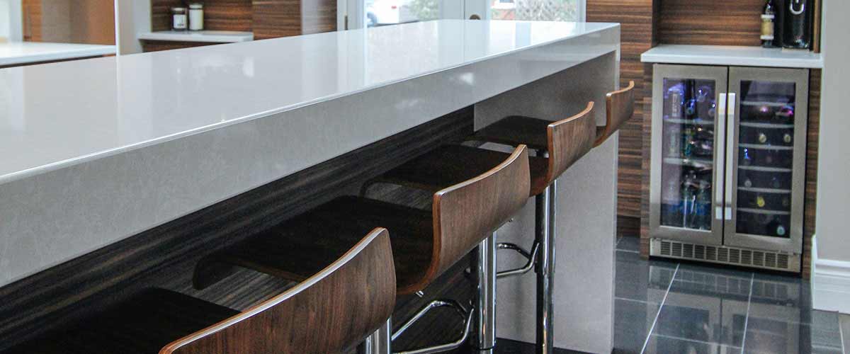 Quartz is a man-made material that consists of 93% crushed quartz mixed with pigments and epoxy resin. Unlike natural stone, it doesn’t need periodic sealing, polishing or reconditioning. Because it's non-porous and non-absorbent, it won't draw in moisture from raw or leftover food, which can harbor harmful bacteria. A great choice where overhang is needed without support.